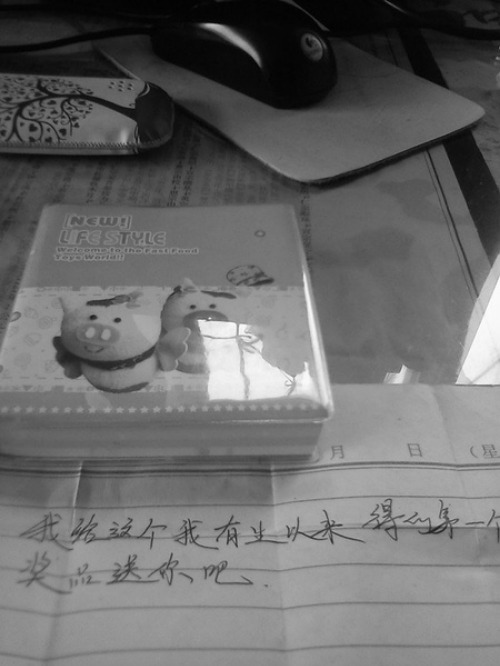 高中生活,手机已经很普及,只是不知道哪个文艺狗开了先例,班内流行起传纸条的游戏。忘了是怎么聊起,反正最后让他知道了自己的生日,我假装卖萌伸手要礼物。然后他就用没水的圆珠笔在我的口水纸上回复我,写了那些话。这是我收过最有意思的礼物。后来我把它藏在最爱的书中,而纸上他的字逐渐模糊,几近消失。事实上,我们从未一起过,可是当我看到这个纸条却感觉我们分手过。